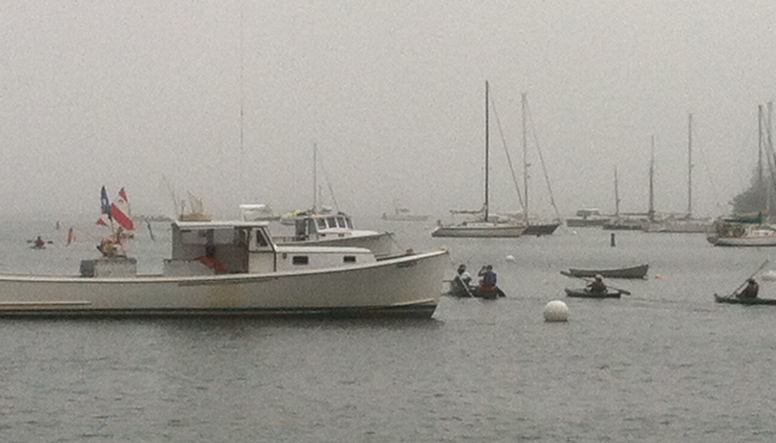 Undeterred by fog, competitors assemble for the Long Cove Regatta.