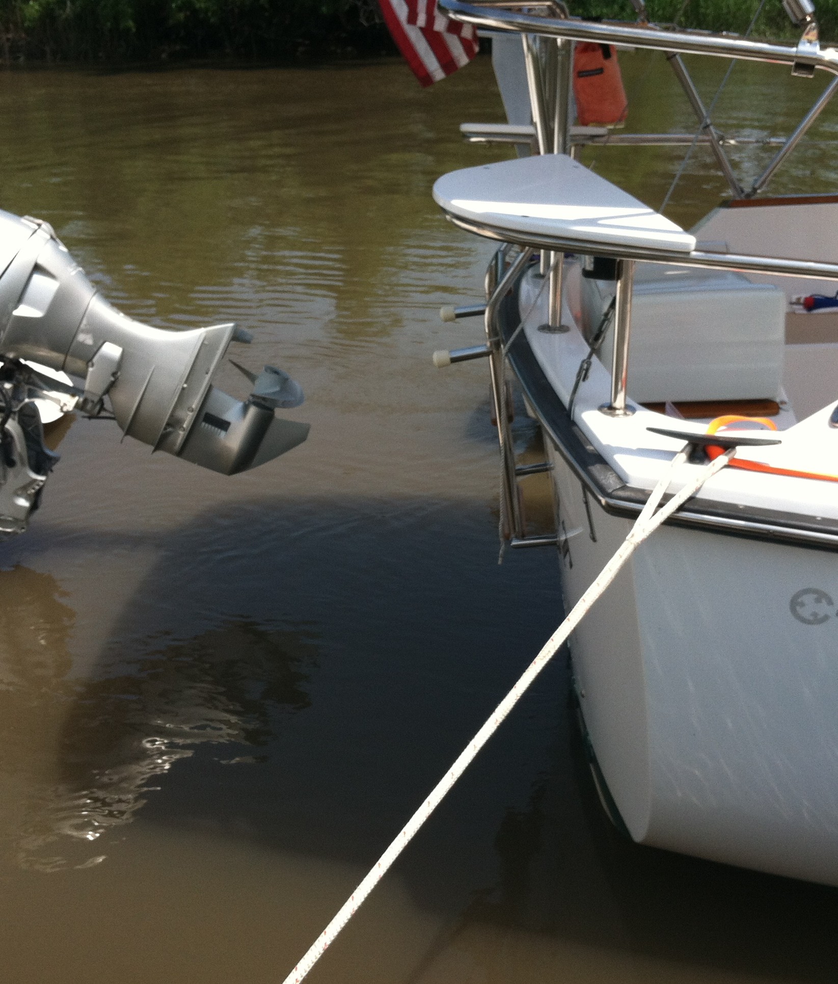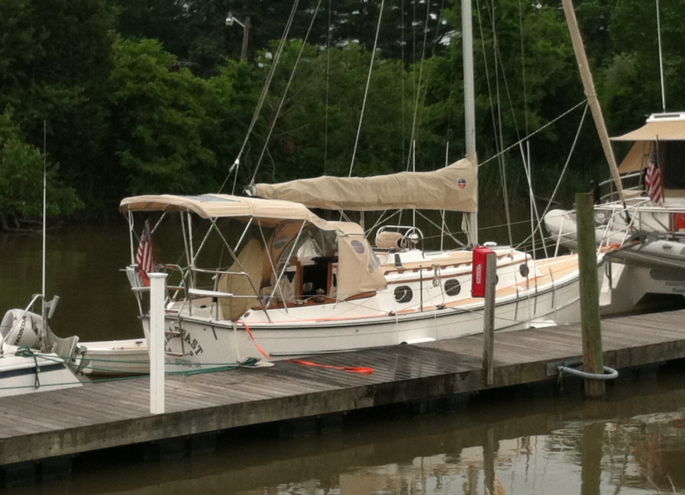 Docklines taut and here she sits with a foot to spare! (Steadfast don’t need no stinkin’ bow thrustas.) Her skipper did need a good bit of direction from Tim along with timely line-handling by Tim and Tara. These folks are great, make everyone feel right at home, and put Delaware City Marina on a short list of favorite places to dock.