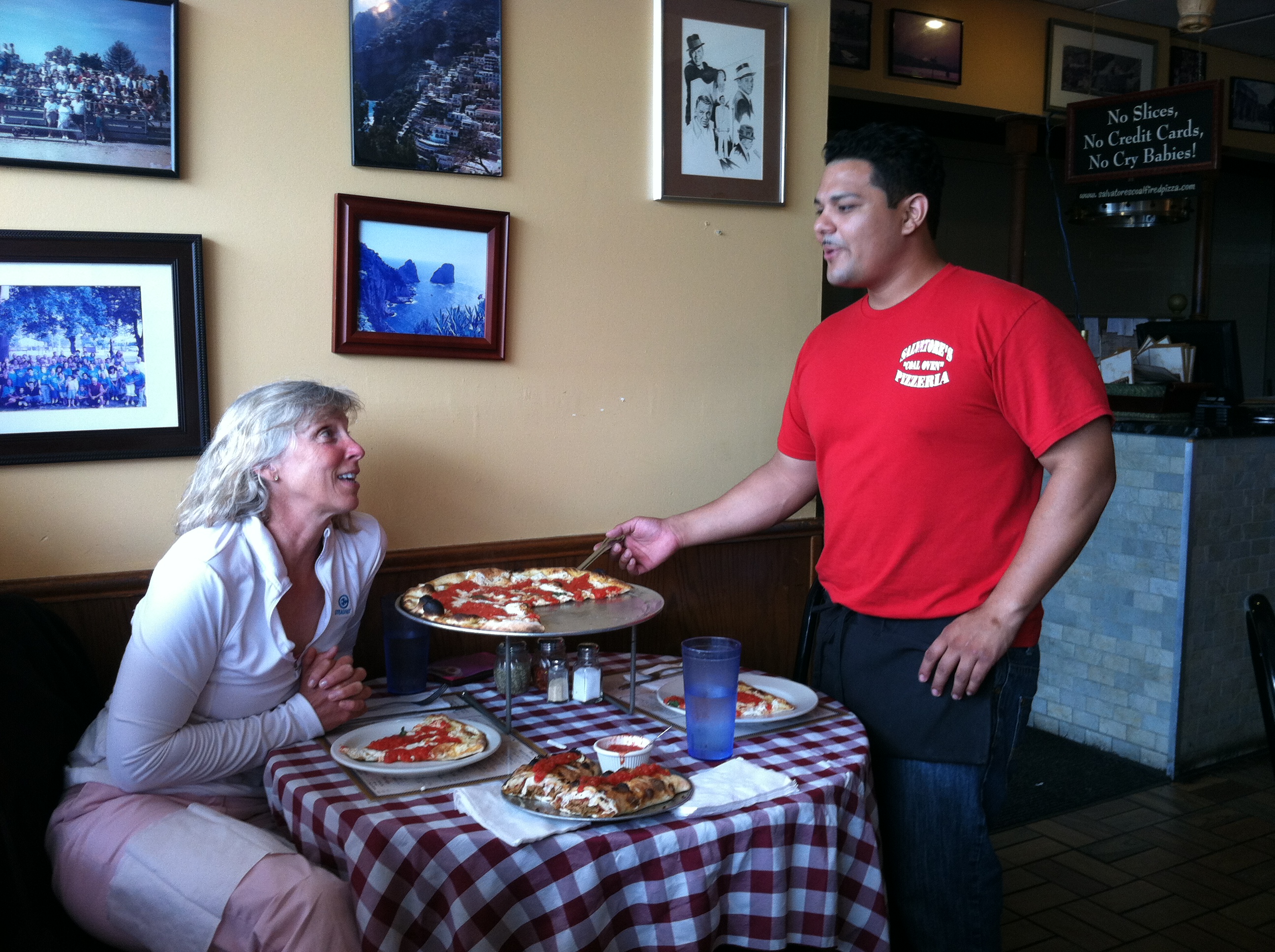 Shortly after 1400, the walk begins back down Harbor, along Shore and out to Salvatore’s Coal Oven Pizzeria in ManorHaven. Brian reports that Sal’s related to the Grimaldi family which used to own Manhattan’s top-rated pizzeria. Zagat, he says, rated Sal’s the third-best in the US! The crew of Steadfast rates it well worth the walk.