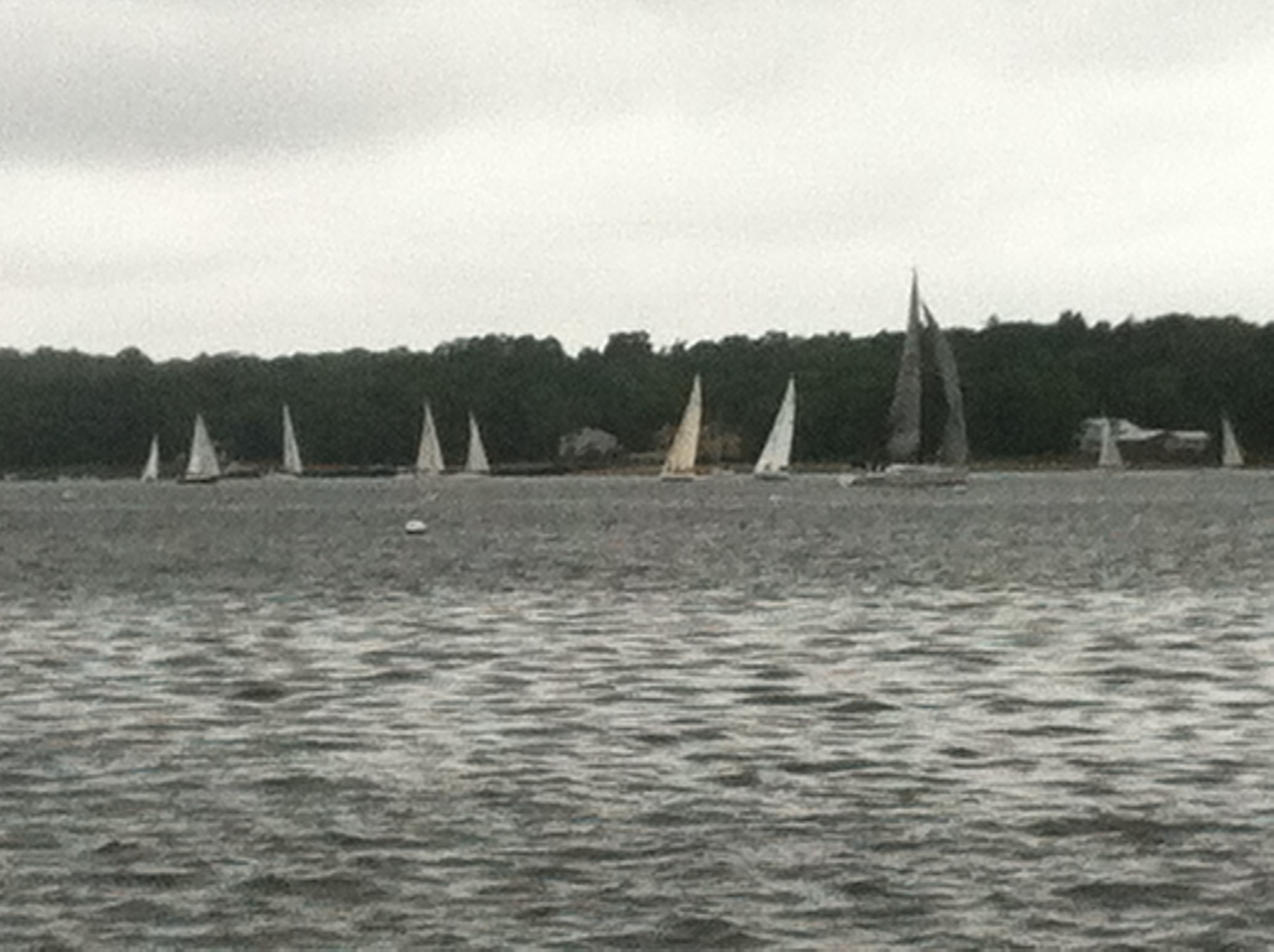 The sky is a gray scale, from a bright near-white through tiers of smoke-gray to the charcoal that threatens rain as it has all day. Boats continue to swing on their moorings, now facing so’east most often as the wind clocks to that quadrant. The dinghy keeps spashing in the short choppy sea that is the harbor of Port Washington, New York.