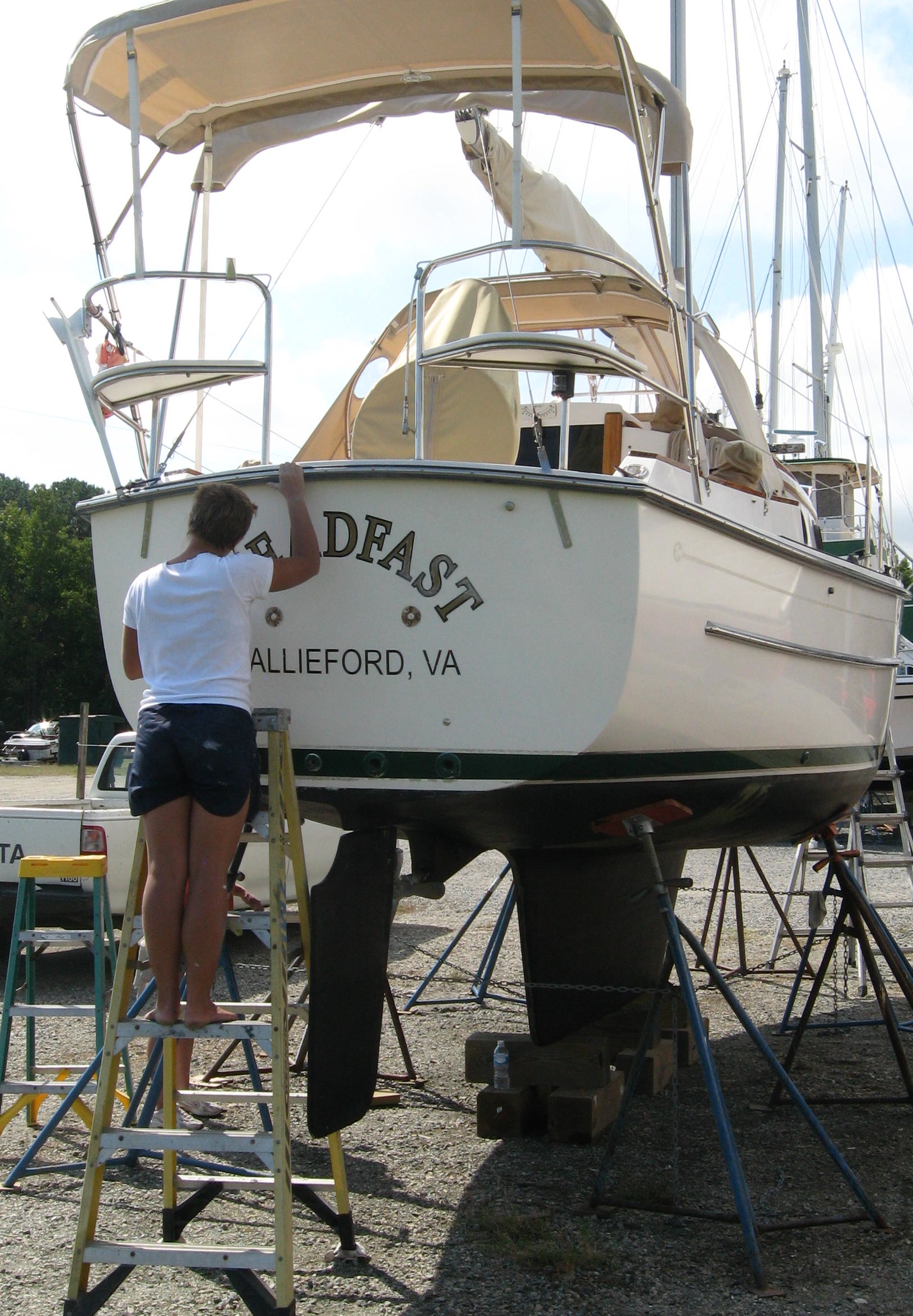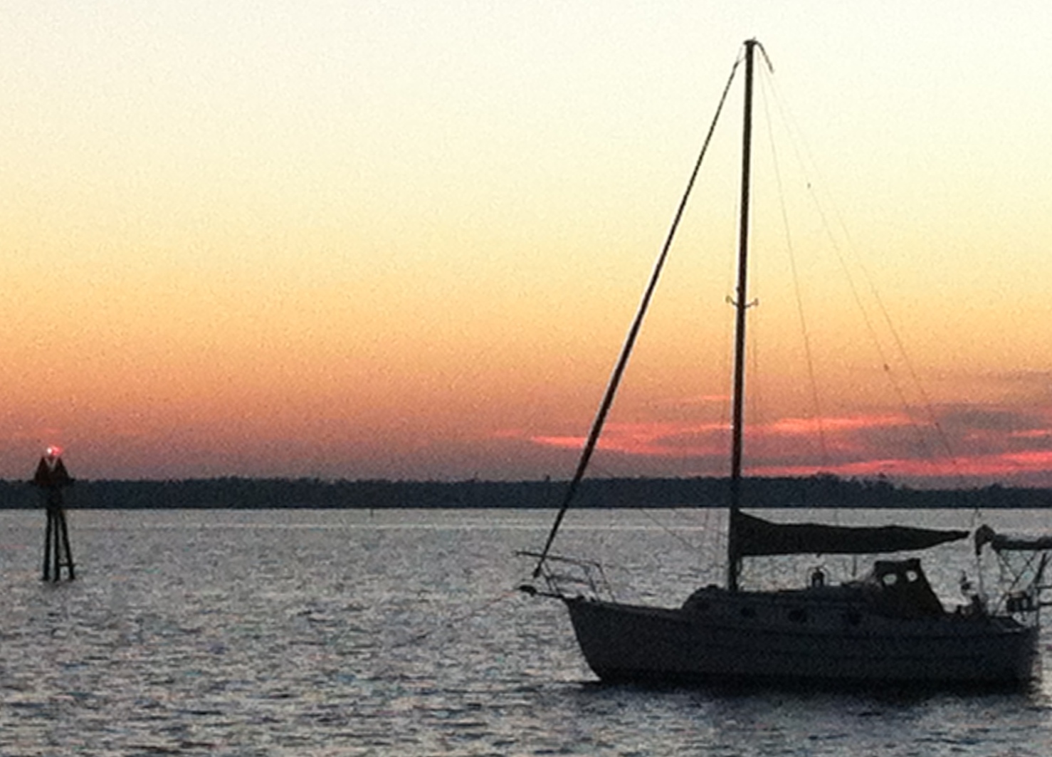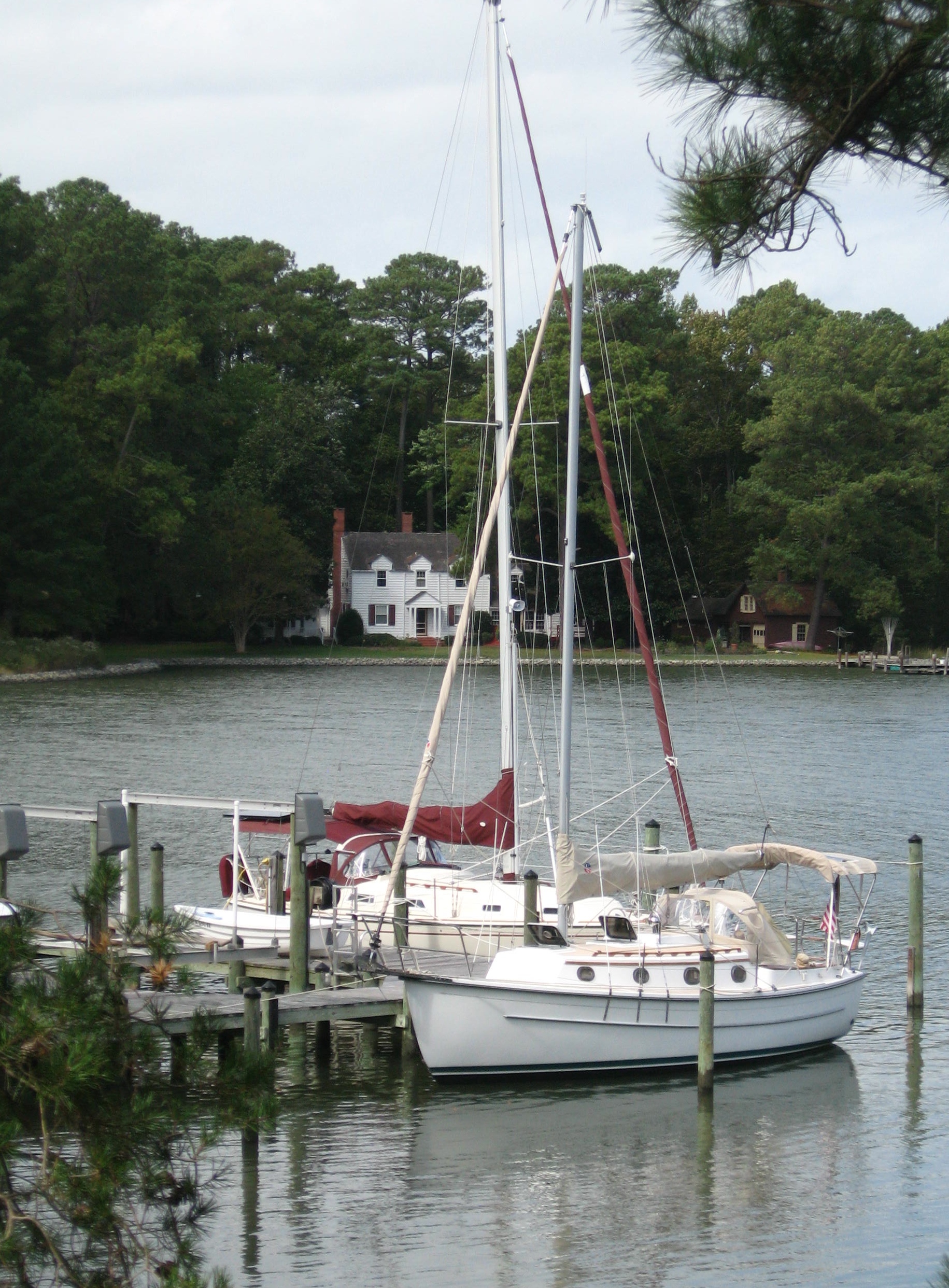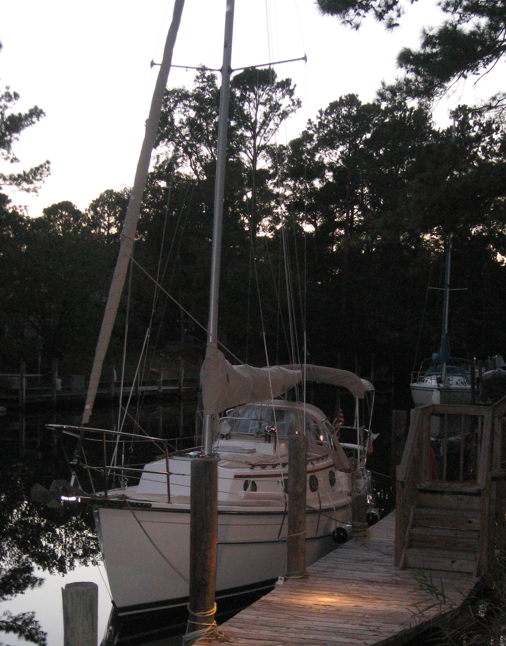 Up in the creek, there’s a hard turn to port to squeeze between Deaton’s Boatyard and Sailcraft Marina, down what seems sure to be a dead end. Instead, the narrow fairway of Tarpon Inlet splits, homes on each high bank hidden by towering pines. Each home with a pier, each pier a vessel and most of those sailboats. Steadfast turns here to the west and, by 1630, is tucked in at the pier behind Miss Helen’s house, masthead in the pines.