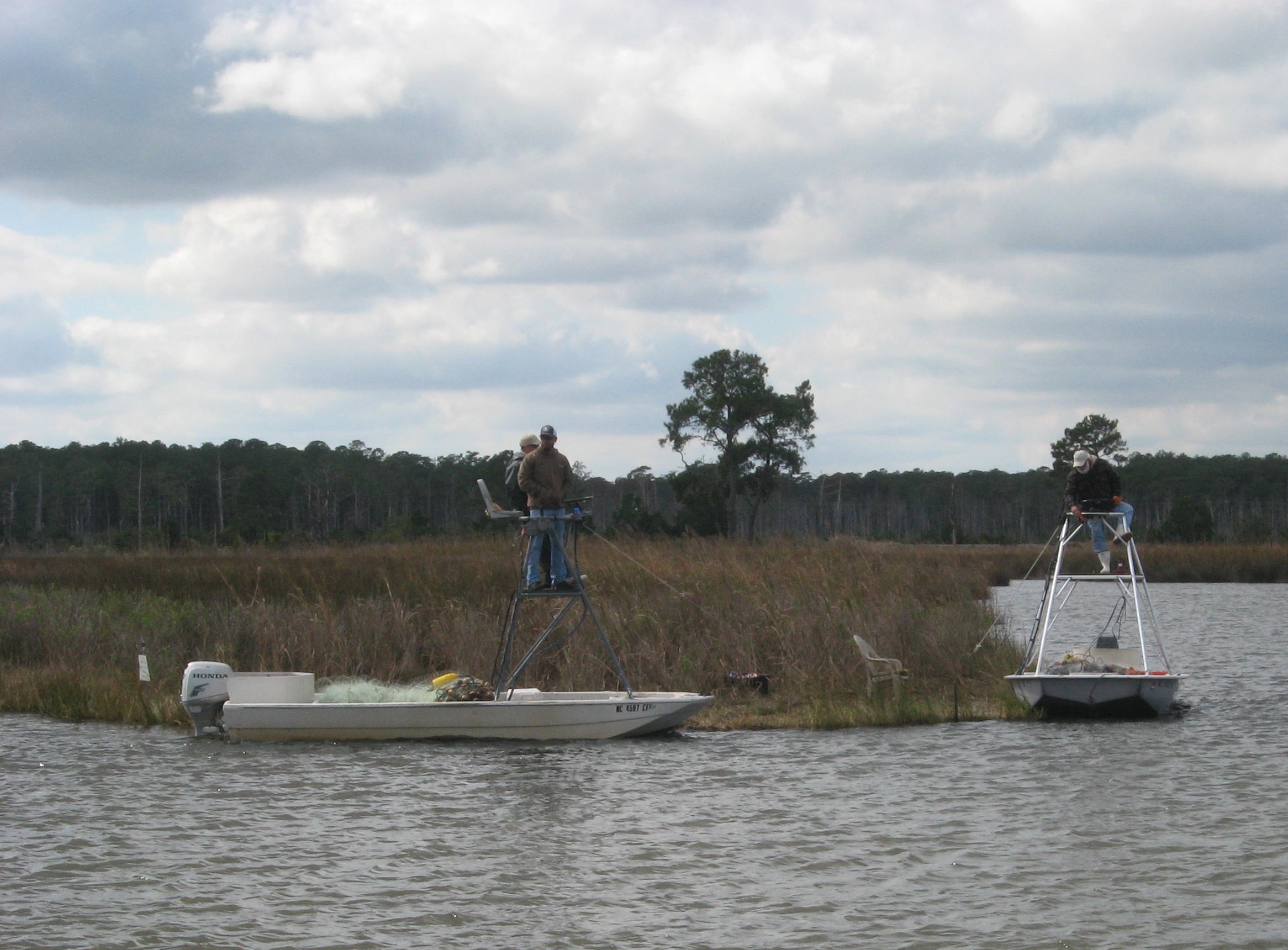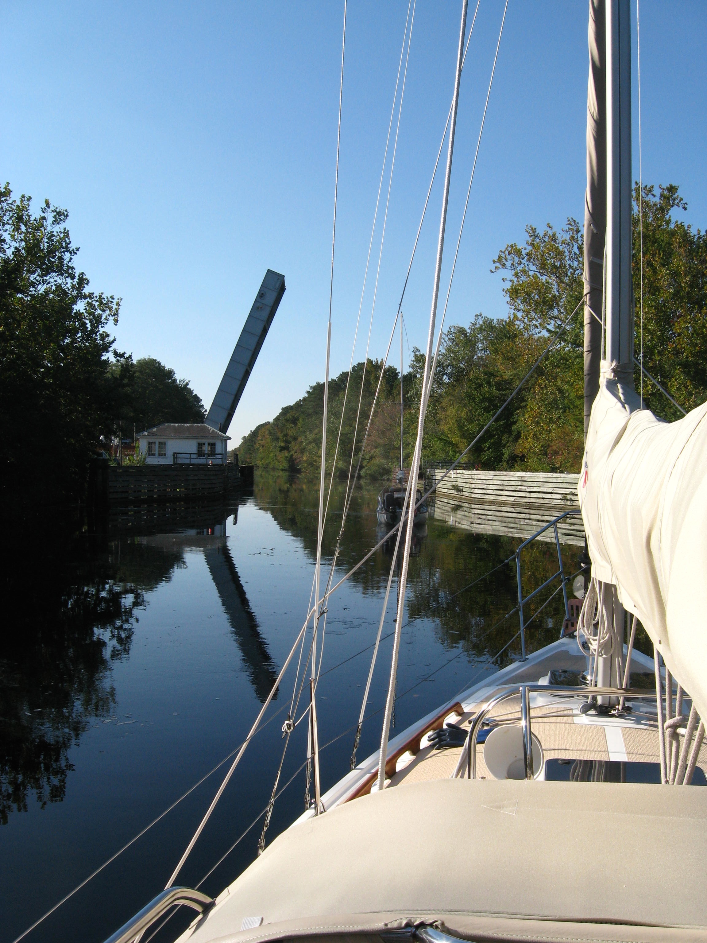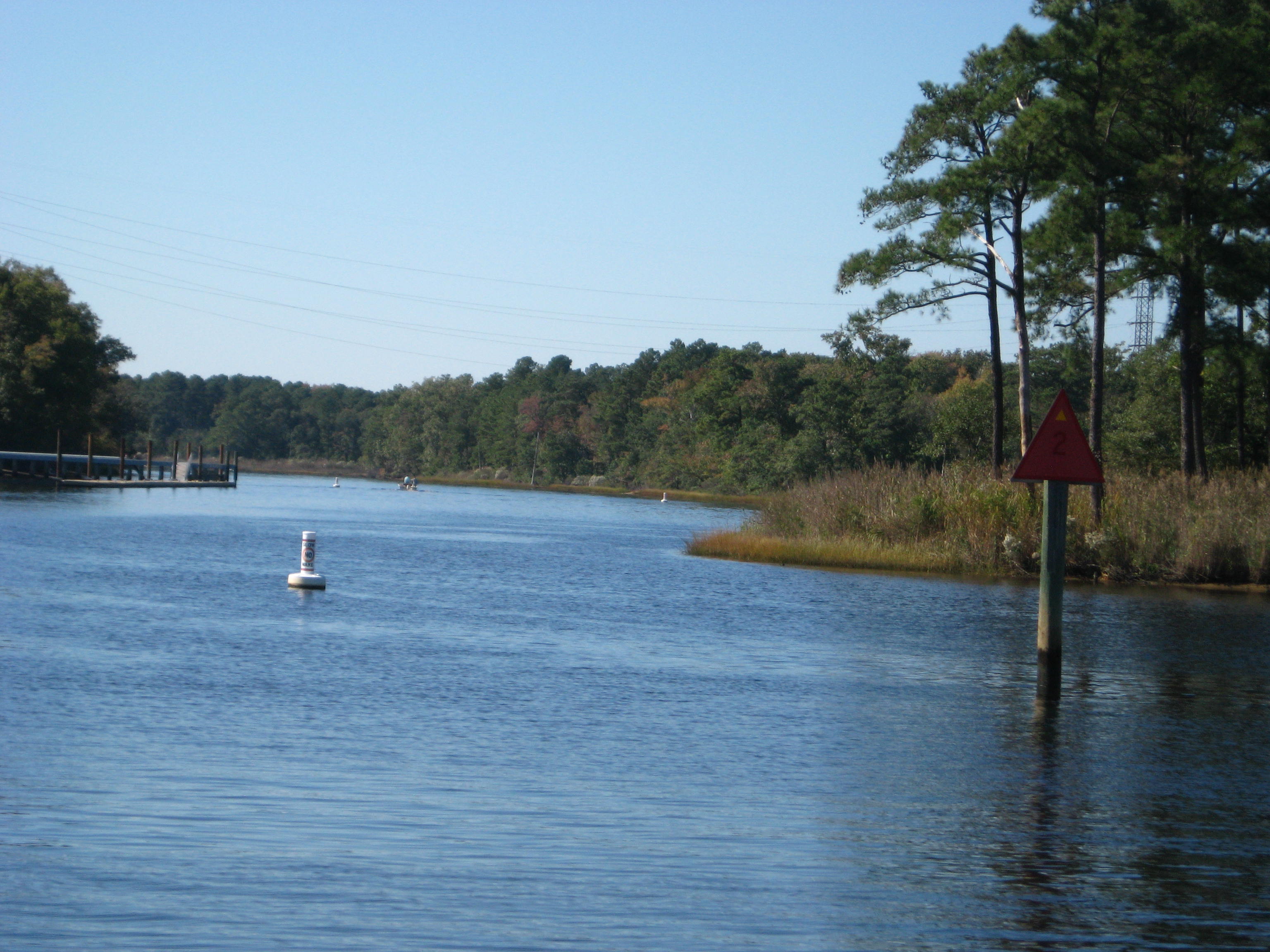 The four-miles across the Pamlico River are quickly astern and Steadfast turns due south down narrow Goose Creek. The genny’s no longer much help but there is a nifty current (enjoy while we can!) that sweeps her along past Eastham Creek, the first of a couple of anchorages that had been considered for an overnight stop. But it’s just lunch-time, far too early to call it a day, so on she goes past shrimpers working the flats, under the Hobucken Bridge and abeam of a big girl tied up at R. E. Mayo’s wharf.