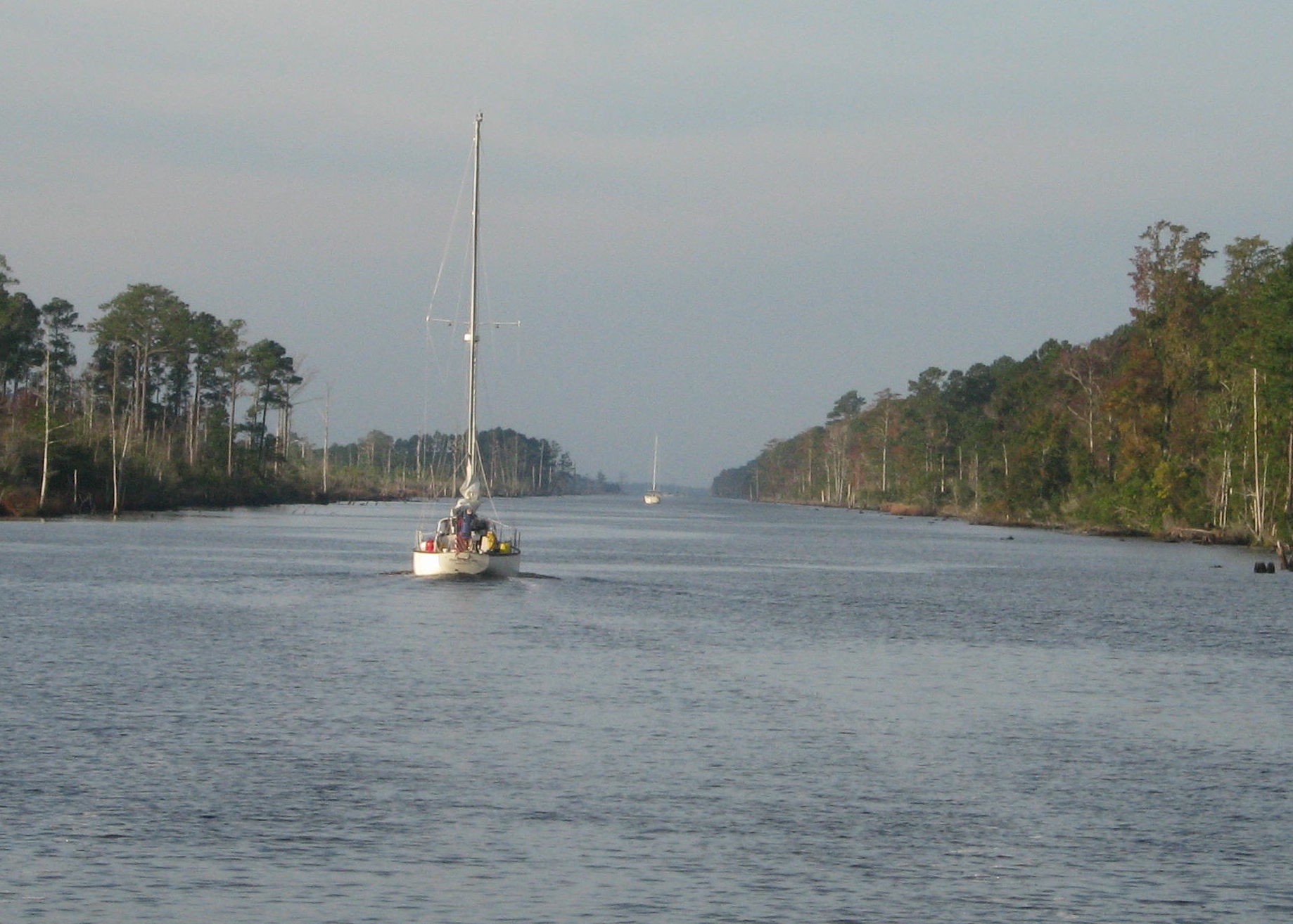 A nor’westerly puts 12 knots over the transom, giving Steadfast an extra kick out of Upper Dowry Creek and into the Pungo River. She turns to the west, the genny unfurls and just like that, she’s (motor-) sailing downstream at a sprightly five-and-a-half knots (six-and-a-half miles-an-hour). The Dudley Dix schooner Adventure follows, Lee and Dick having said they, too, plan to layover in Oriental while the wind becomes a nor’easter this weekend.