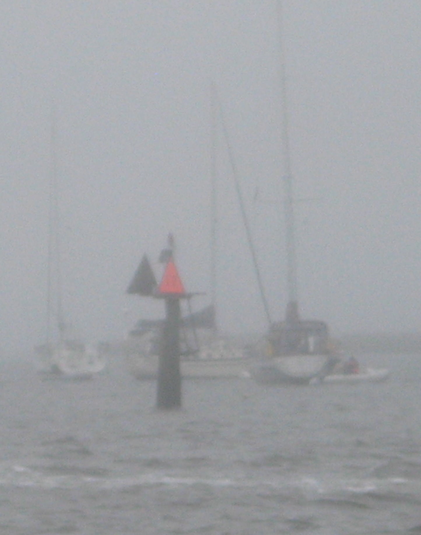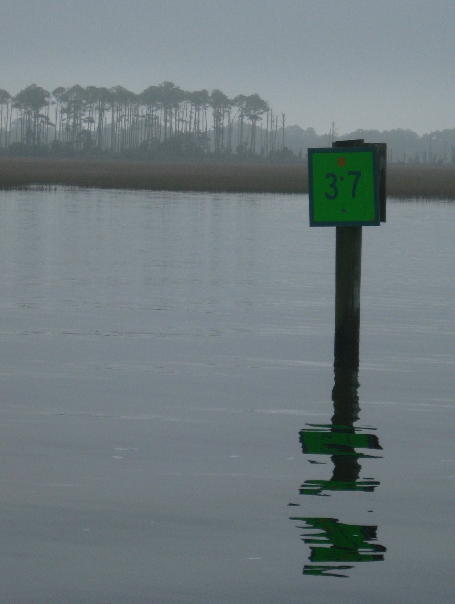 Well, mistake or not, there it is. Not quite as thick and foreboding as yesterday but enough to keep Steadfast on the pier a bit later than usual this morning. By 1035, the far side of the river has revealed itself, spurring hope that the day’s undertaking may be within reason. So she’s off, back onto the waterway and motoring southward once again and, again, virtually on her own. The occasional weekend angler but not a Snowbird to be seen.