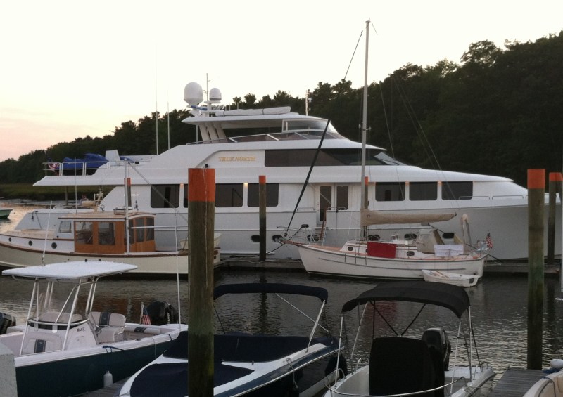On one of the hottest nights of the summer, Steadfast sits in the wind shadow of a hundred foot motor yacht at Chick’s Marina, Kennebunkport, ME.