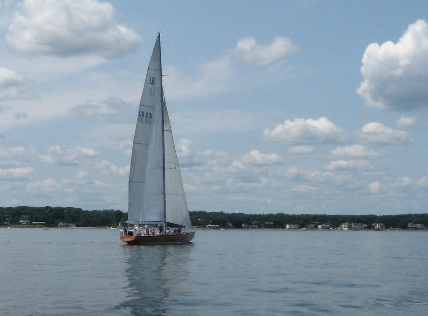 There’s a perfectly round slice of cantaloupe hanging somehow just above the treeline to the east, the oaks and spreading maples that stand tall along the shore of Dutch Harbor on the west side of Conanicut Island (Jamestown, RI). The engine of a small airplane rumbles through the night air to the east. A couple of chuckles curls across the water from a cockpit to port but otherwise, it’s a quiet night.