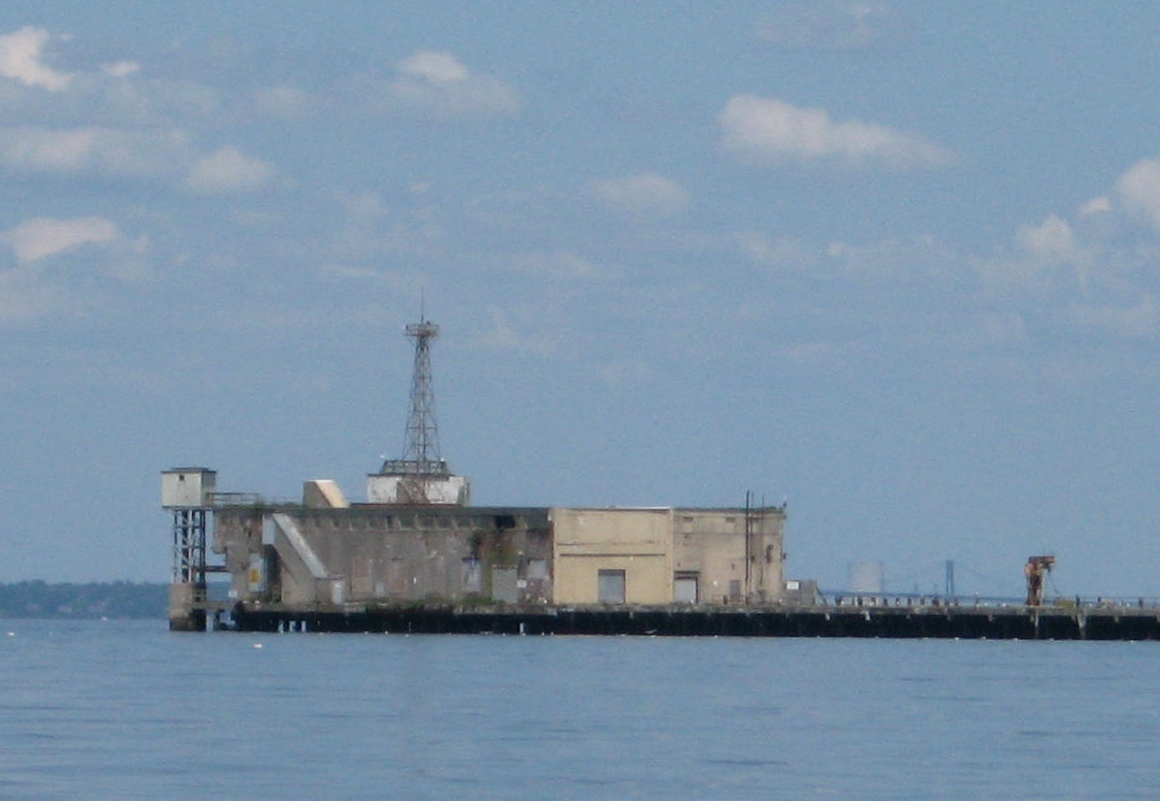 The painted brick Sandy Point Light tower sits among beach front homes on on the east shore of Prudence Island.