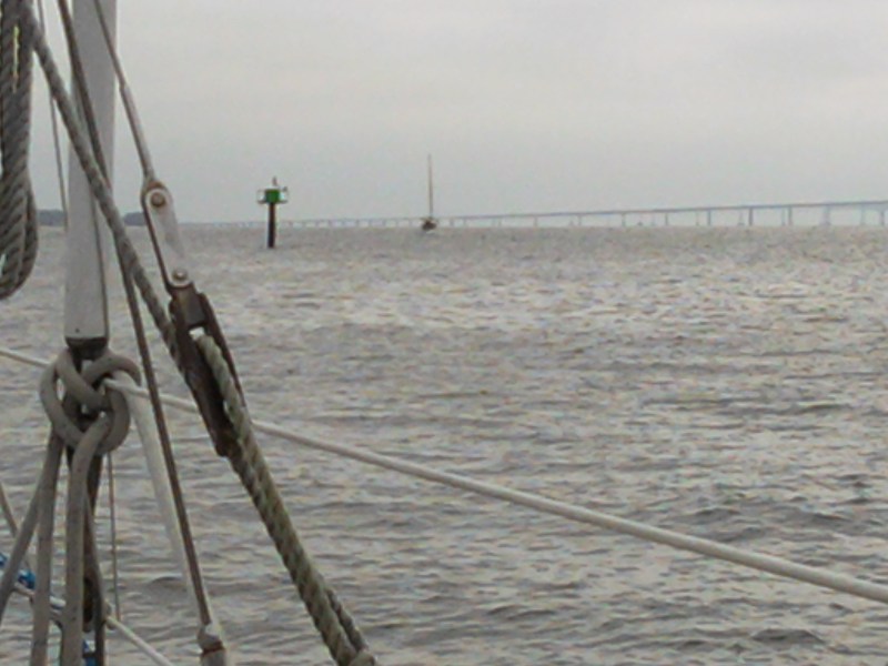 The crew of Plover bids farewell to Steadfast as she motors into the murky morning from Lake Ogleton.